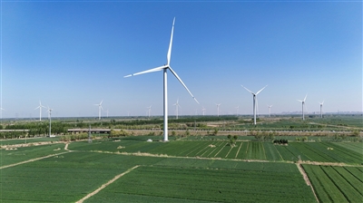 近年来,山东省乐陵市坚持生态优先、绿色发展,充分利用乡村丰富的风能资源和盐碱地、坑塘等闲置用地,推进风力发电、光伏发电等绿色产业发展,把自然资源转化为产业优势,助力推进乡村全面振兴,优化能源结构,着力实现高质量生态保护和可持续发展。图为乐陵市铁营镇大白张村风力发电机组与广阔田野交相辉映。 人民图片