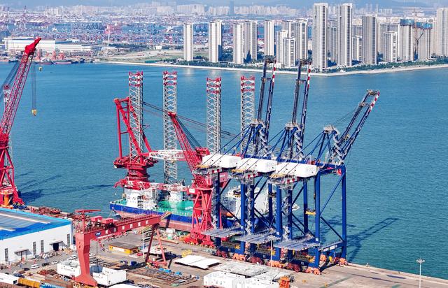 8月28日,搭载智能船舶系统的自升自航式海上风电安装平台“港航平5”在青岛西海岸新区交付(无人机照片)。新华社发(张进刚 摄)