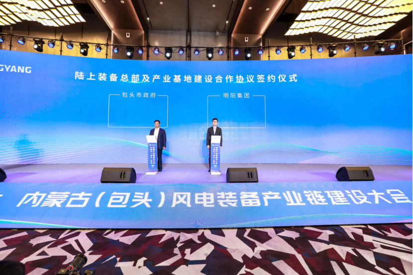 会上,包头市委常委、常务副市长刘海泉与明阳集团高级副总裁张瑞签订明阳集团陆上装备产业基地建设合作协议。包头市石拐区政府、明阳集团与内蒙古宝航风电有限公司、南方宇航高精传动有限公司等9家外部引进供应商签署合作协议。
