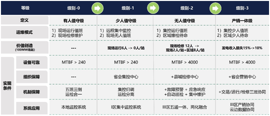 随着设备可靠性大幅提升,视频巡检成本大幅降低,加之技术人员增长速度难以匹配快速增长的装机容量,2023年以来建设区域维检中心,将现场检修班移至县城,正成为场站下一步生产变革的重点。预计3-5年内,全国将有50%场站实现区域化维检管理,其中有20%的场站达到无人值守级,即每个10万千瓦的场站,维检人员12人将变为现场2人+区域8人,每个场站用工人数减少2人。