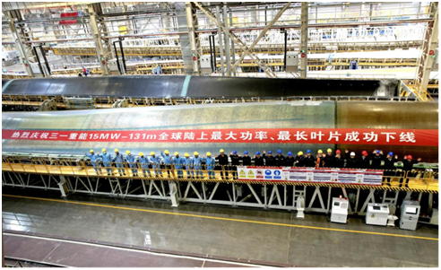 1月21日,三一重能131米陆上风电叶片在内蒙古巴彦淖尔零碳数智产业园下线,刷新全球最长陆上风电叶片纪录。