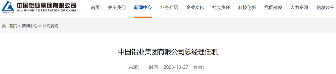 消息来源:中国铝业集团有限公司网站