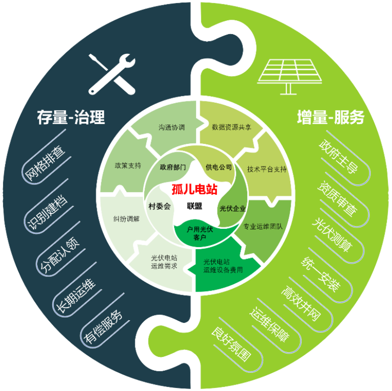 “孤儿电站”治理联盟是一个光伏相关方的资源平台,包括政府主管部门、光伏企业、供电公司、村委社区多方,本着“服务零收费,产品成本价”的原则,协同解决曾经光伏发展中留下的社会问题。安装光伏电站的村民可通过村委、供电公司等途径联络“孤儿电站”治理联盟的光伏企业,获得光伏电站排查、识别、沟通、运维、治理一条龙服务。
