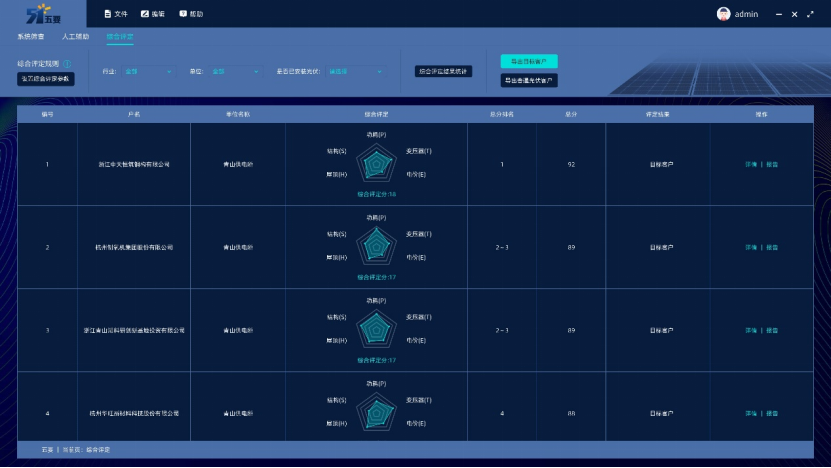 传统的光伏资源开发中,前期投资存在开发条件不确定、人工评判缺乏标准、客户开发效率低下等问题,如何改变传统开发模式,建设一套科学的投资系统使前期评估变得更加高效精准,迅速锁定优质客户,成为摆在我们面前亟需解决的发展难题。在这种背景下,浙江恒力电力承装有限公司通过不断的探索与研究,找到影响分布式光伏市场开发的五类核心要素:即功耗、变压器、电价、屋顶面积以及房屋结构;研发出一套基于五要素的分布式光伏投资评估系统。根据这五类要素各自不同的特性,制定出一套量化评分机制,基于该量化评分体系,依托集采系统收集的企业用电大数据作为五要素评定体系的底层数据支撑,三步筛选流程作为寻找目标,首创“三步五要素”客户筛选系统,以三步筛选法为核心,五种要素作为数据依据,分三步对潜在的分布式光伏目标客户市场进行系统化的筛选,建立科学的开发分布式光伏市场资源体制,研发出分布式光伏开发前期业务大数据平台,为发展分布式光伏提供优质的前期市场开发资源环境。