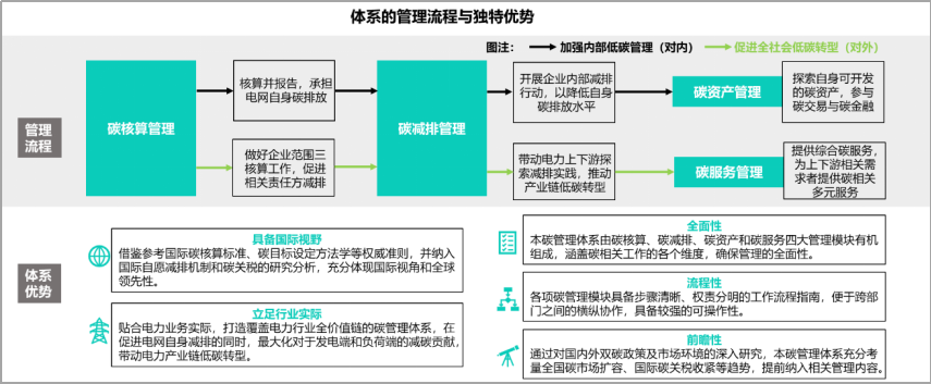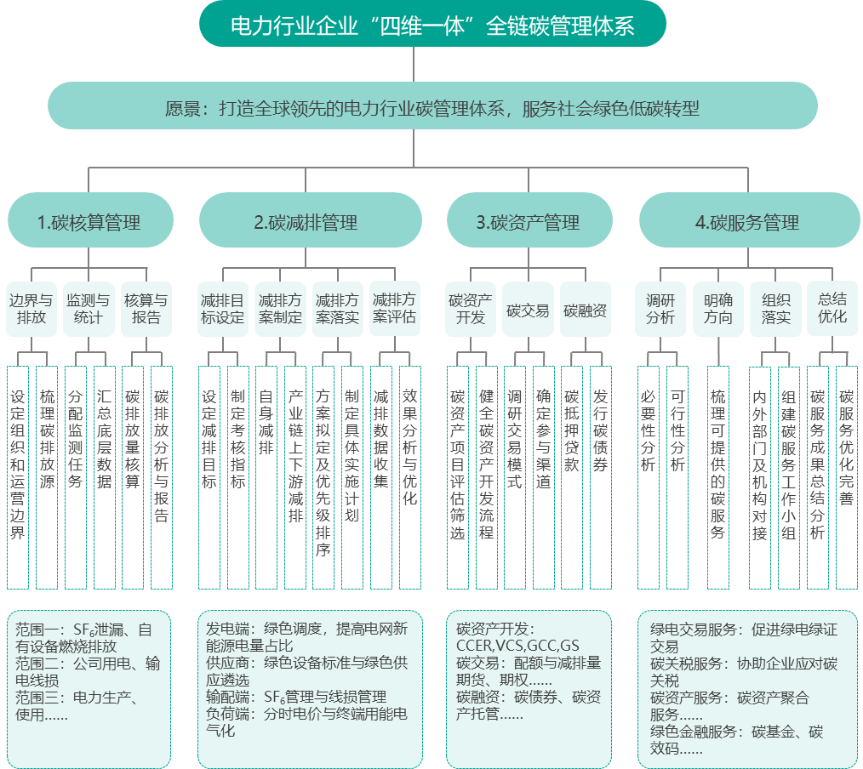 绿色方向:为积极响应国家双碳战略目标,支撑新型电力系统建设,国网浙江省电力有限公司经济技术研究院(简称“国网浙江经研院”)成立了双碳领导小组,提出了“四维一体”全链碳管理体系,致力于用浙江智慧打造全球领先的电力行业碳管理方案。该体系由碳核算、碳减排、碳资产与碳服务四大管理模块有机组成,充分发挥电力行业企业绿色引领及低碳示范作用,最大化其对于电力系统的降碳贡献。