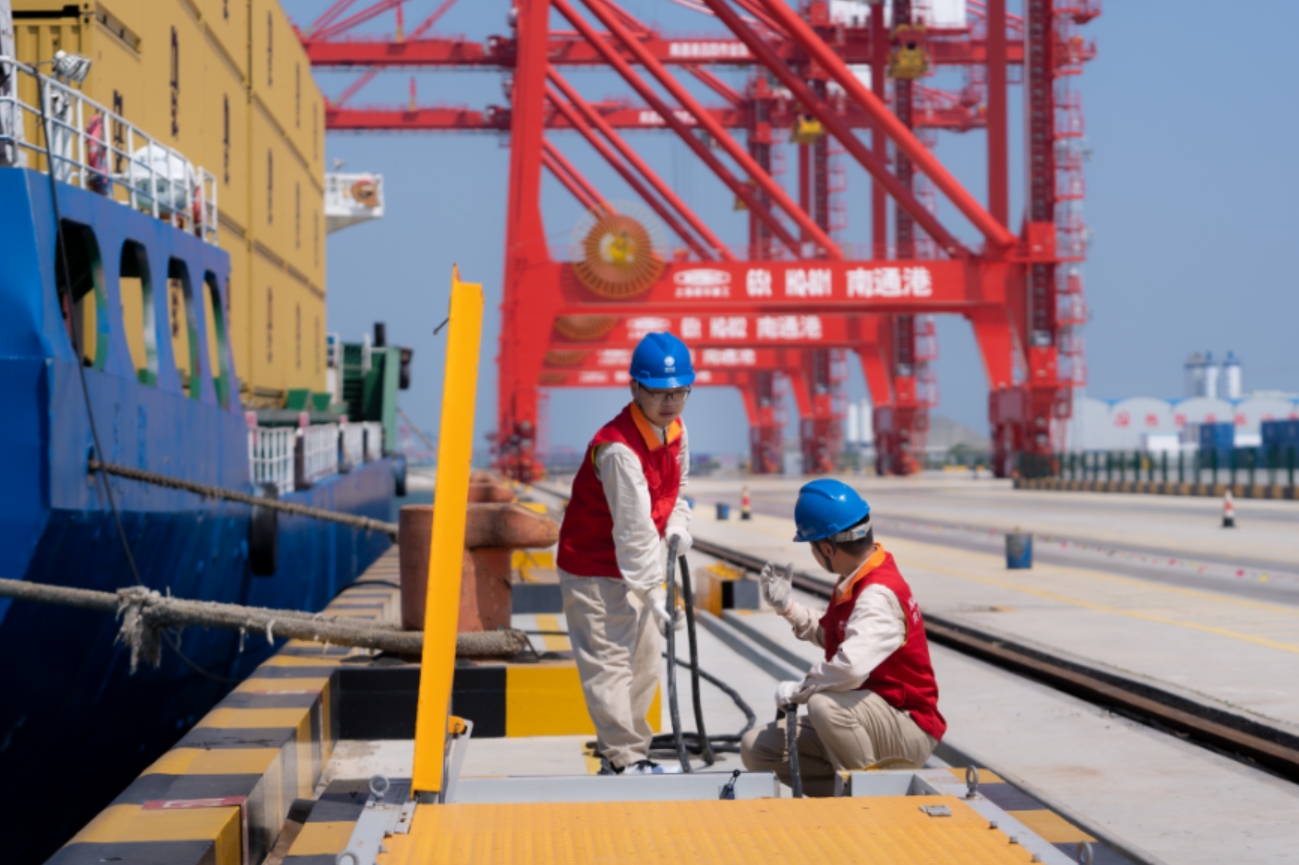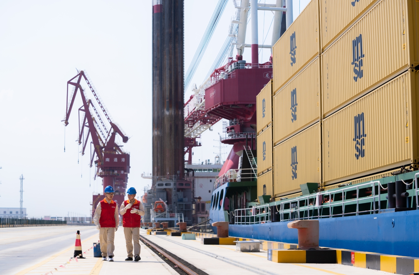 国网启东市供电公司共产党员服务队对通州湾吕四起步港“2+2”码头岸电设施进行仔细安全检查。