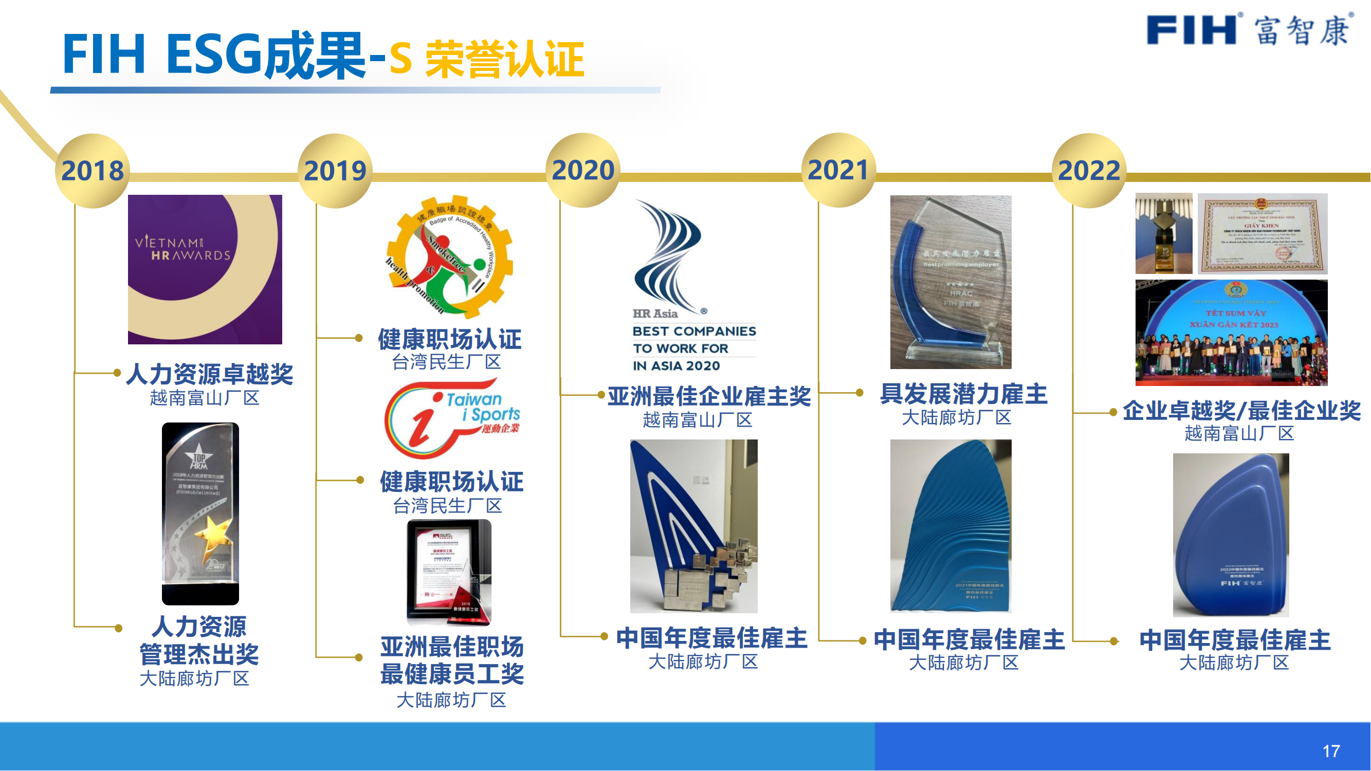 通过系列举措,公司也取得了诸多认证并获得同业前13%的评级结果,且多次获得人力资源卓越奖、亚洲最佳企业雇主奖、成功认证健康职场,亚洲最佳职场最健康员工奖等,更是连续三年斩获:中国年度最佳雇主奖。