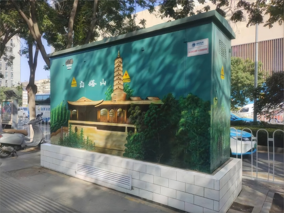 二是文旅融合,亮出最美“天际线”。公司积极与政府部门协调沟通,先后完成城区主干道45基杆架空线路的入地改造,在满足区域内未来15-20年的负荷接入需求的前提下,最大化避免树木生长及外力对架空线路的安全隐患。同时大胆创新,在环网柜面和配电箱面上描绘出“白塔山”、“黄河母亲”、“中山桥”等地标景点,在夜晚的明灯辉映下栩栩如生。