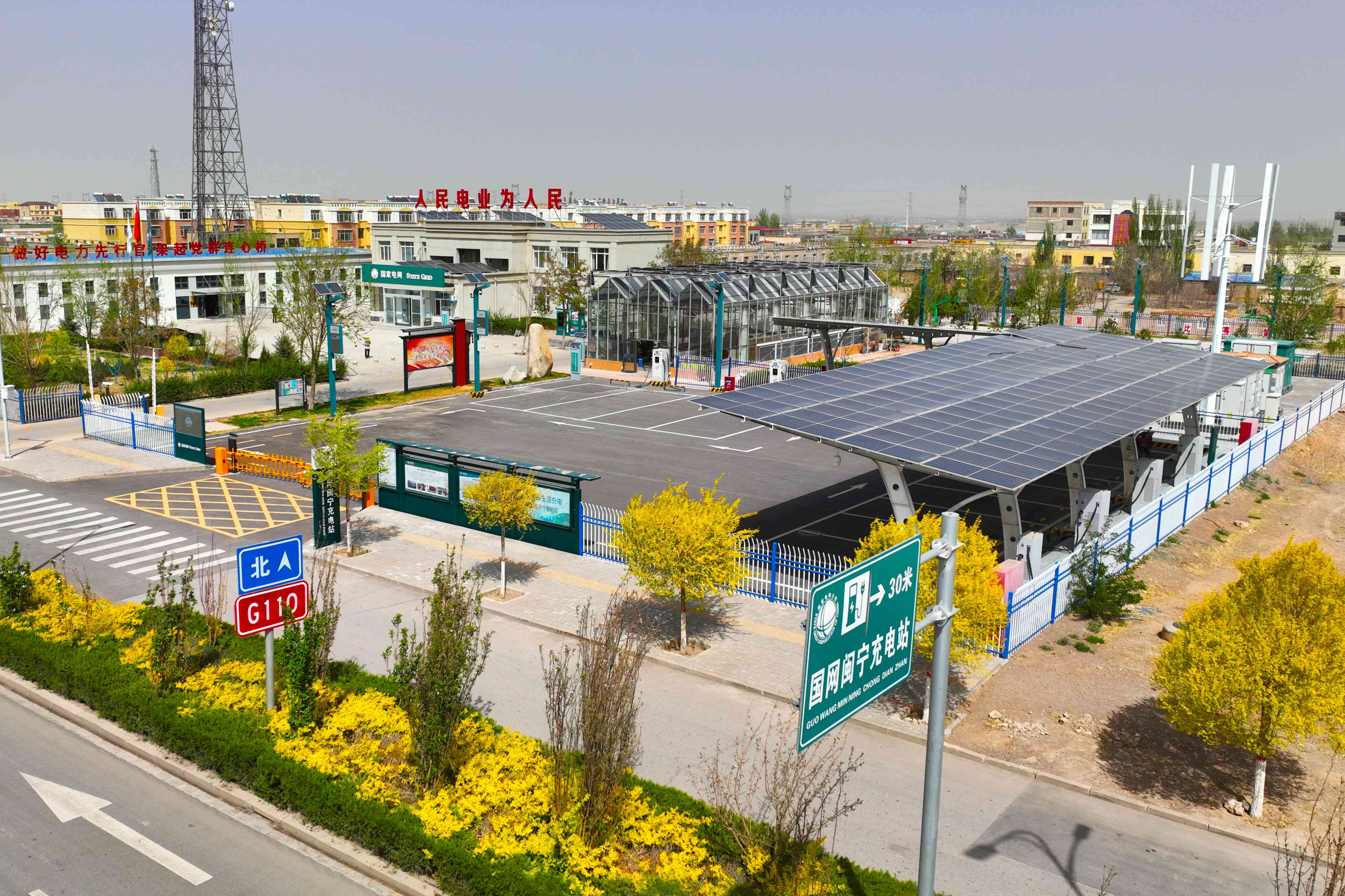 在闽宁镇乡村振兴的道路上,国网银川供电公司以“绿色能源”“绿色电网”“绿色产业”为着力点,探索形成了具有电网企业特点的乡村振兴服务模式,通过“电力企业+社会资本”总投资约21.64亿元的30项重点工程建设,全力推动在年底将闽宁镇建设成为西北首个“绿电小镇”,建成后预计年节约标煤约合7万吨,减少碳排放4.8万吨,为东西部协作的“闽宁方案”注入了强劲绿色动能。