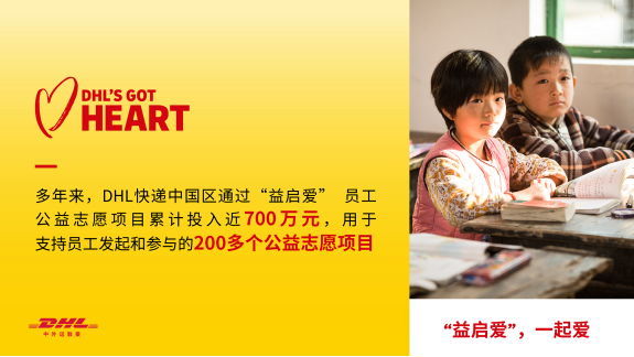 此外,DHL快递中国区还积极投身社会公益,通过“益启爱”(DHL’s Got Heart)员工公益、“推动青年就业”(GoTeach)和“成长阶梯”(Upstairs) 助学金等多个项目,在企业内外持续开展员工和社会关爱活动。