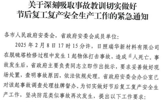 2月13日,极目新闻记者注意到,有微信公众号也发布了这则通知,通知显示,近日山东省日照瑞华新材料有限公司在设备检修时发生事故,有人员不幸身亡,省安委办已对该起事故调查处理挂牌督办。