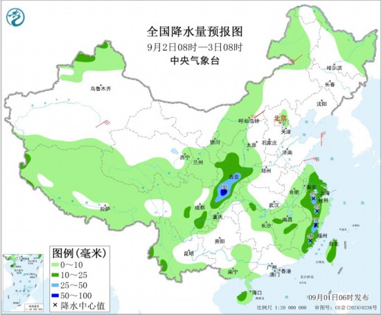 全国降水量预报图(9月2日08时-3日08时)