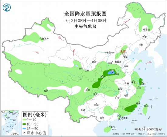 全国降水量预报图(9月3日08时-4日08时)