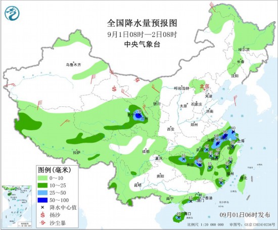 9月1日08时至2日08时,青海东部和南部、甘肃中部和西南部、重庆东南部、湖北东部、湖南北部和东部、江西中北部、安徽中南部、江苏中南部、上海、浙江北部和东南部、福建、广东西南部、海南岛、云南南部以及西藏西部和东北部等地的部分地区有中到大雨,其中,青海东部、甘肃西南部、安徽南部、江苏南部、湖南东北部、江西西部和北部等地局地有暴雨(50~90毫米)。新疆北部和南疆盆地、内蒙古西部、甘肃西部、山东半岛等地的部分地区有4~6级风,其中,新疆山口地区有7~8级风,阵风9~11级;南海南部海域有4~6级风、阵风7级。