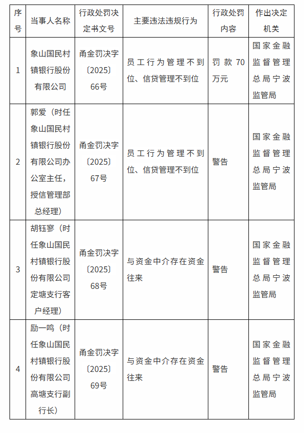 近日,国家金融监督管理总局处罚信息显示,象山国民村镇银行股份有限公司因员工行为管理不到位、信贷管理不到位,被国家金融监督管理总局宁波监管局罚款70万元。同时,郭爱(时任象山国民村镇银行股份有限公司办公室主任,授信管理部总经理)因员工行为管理不到位、信贷管理不到位;胡钰寥(时任象山国民村镇银行股份有限公司定塘支行客户经理)因与资金中介存在资金往来;励一鸣(时任象山国民村镇银行股份有限公司高塘支行副行长)因与资金中介存在资金往来,被国家金融监督管理总局宁波监管局警告处理。