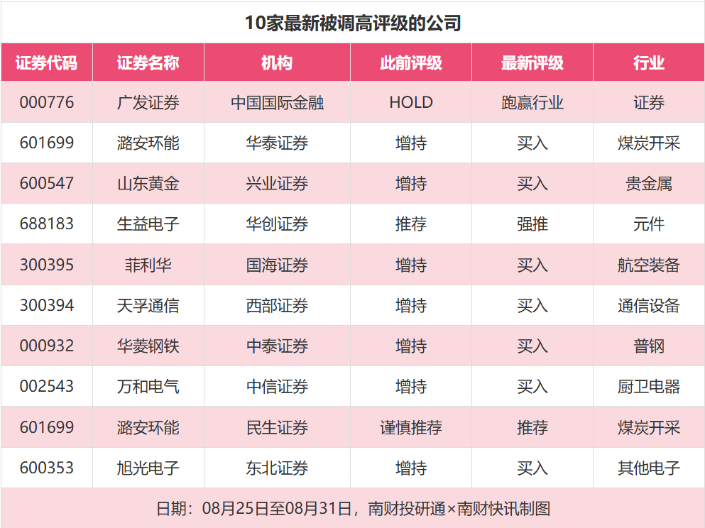 评级调高方面,8月25日至8月31日,券商调高上市公司评级达到36家次,最新数据包括了中国国际金融对广发证券的评级从“HOLD”调高至“跑赢行业”,华泰证券对潞安环能的评级从“增持”调高至“买入”,兴业证券对山东黄金的评级从“增持”调高至“买入”。