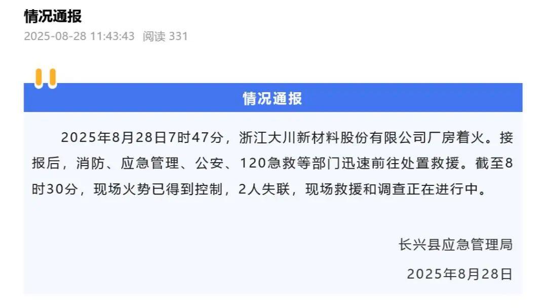 据浙江湖州长兴县应急管理局通报,2025年8月28日7时47分,浙江大川新材料股份有限公司厂房着火。接报后,消防、应急管理、公安、120急救等部门迅速前往处置救援。截至8时30分,现场火势已得到控制,2人失联,现场救援和调查正在进行中。