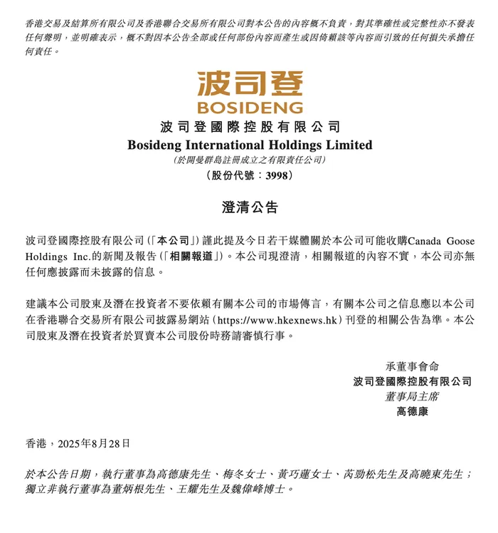 财联社8月29日讯,波司登在港交所公告,公司谨此提及今日若干媒体关于本公司可能收购Canada Goose Holdings Inc.的相关报道。本公司现澄清,相关报道的内容不实,公司亦无任何应披露而未披露的信息。