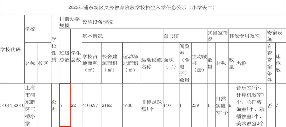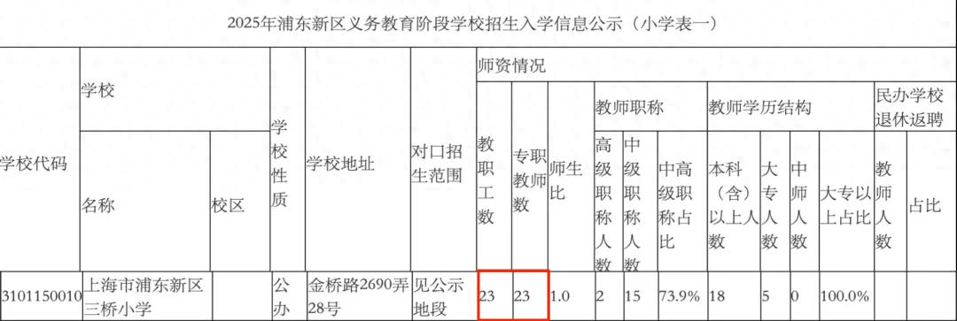 据浦东新区教育局官网4月发布的《2025年浦东新区义务教育阶段学校招生入学信息公示》显示,浦东新区三桥小学目前办学规模一栏中确实标注:班级总数5个,学生总数22人,专职教师23人,师生比1.0。