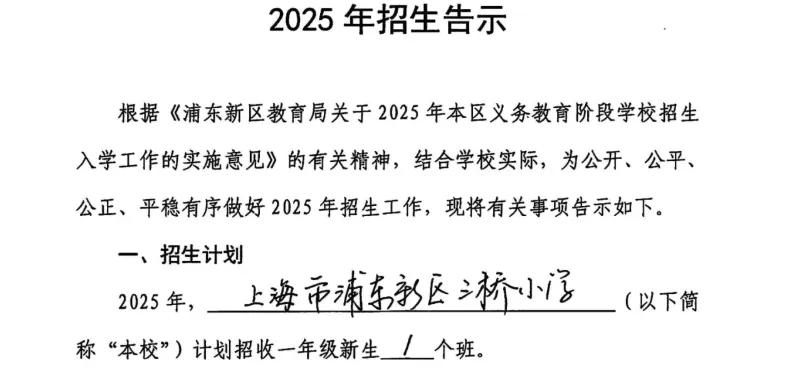 另据上海市浦东新区三桥小学微信公众号4月8日发布的2025年招生告示显示,2025年该校计划招收一年级新生1个班。
