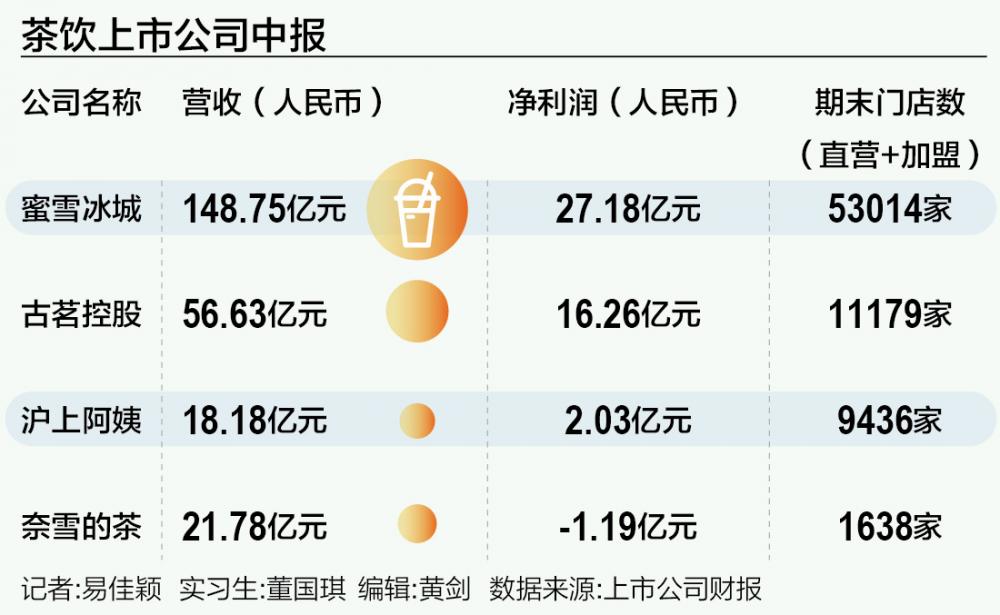 财报显示,蜜雪集团上半年营收148.75亿元,净利润27.18亿元,双双实现40%左右的高增长。古茗则以上半年实现净利润16.26亿元同比激增119.8%,表现抢眼,营收也同比增长41.2%至56.63亿元。
