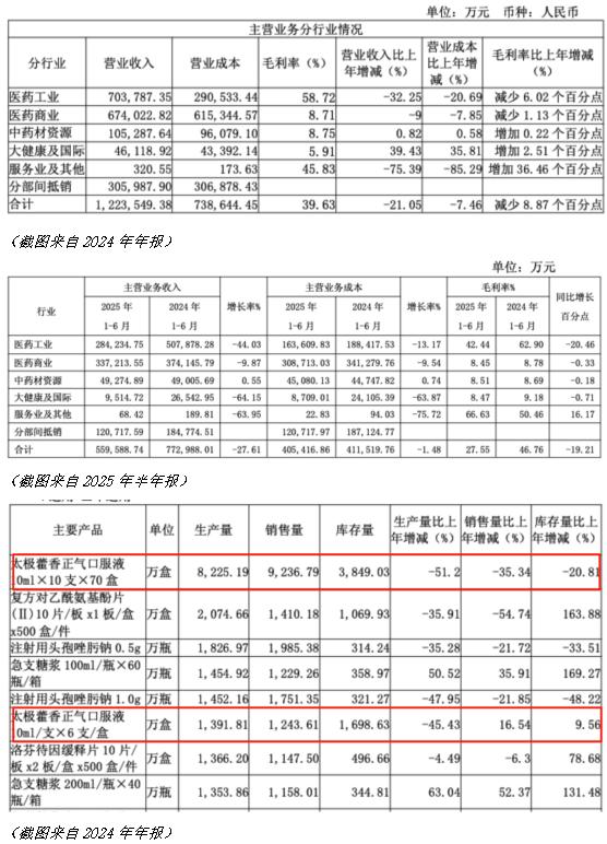 2024年,该板块收入同比下滑32.25%,毛利率减少6.02个百分点;进入2025年上半年,医药工业主营收入继续大幅收缩44.03%,毛利率急剧下降20.46个百分点。以占比最高的呼吸抗生素类药品为例,其收入降幅达44.69%,毛利率减少19.95个百分点,主要受急支糖浆、鼻窦炎口服液及散列通等产品销售不振拖累。紧随其后的消化代谢类药品降幅更为显著,收入下滑45.83%,毛利率降低17.77个百分点,这一品类的业绩下滑主要源于板块“压舱石”产品——太极藿香正气口服液的销售额显著下降。