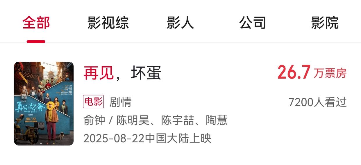 据猫眼专业版数据显示,电影《再见,坏蛋》已于8月22日上映,上映6天,票房仅有26.7万元。