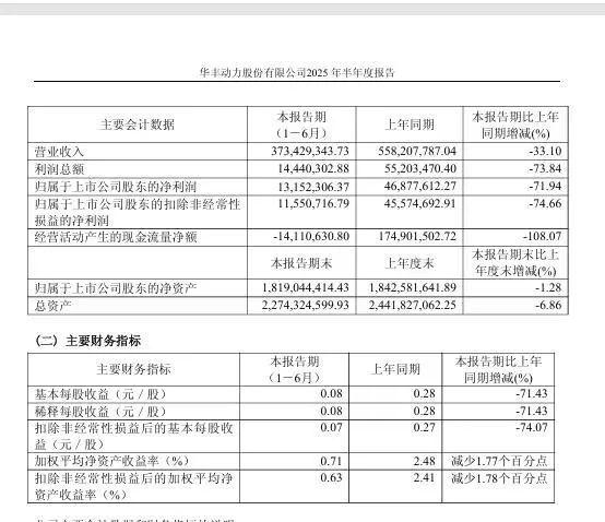8月27日晚间,华丰股份发布的2025年半年报显示,公司上半年营业收入为3.73亿元,同比下降33.10%,对应归母净利润为1315.23万元,同比大幅下滑71.94%,扣非后净利润为1155.07万元,同比下降74.66%。