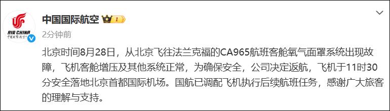 北京时间8月28日,从北京飞往法兰克福的CA965航班客舱氧气面罩系统出现故障,飞机客舱增压及其他系统正常,为确保安全,公司决定返航,飞机于11时30分安全落地北京首都国际机场。国航已调配飞机执行后续航班任务,感谢广大旅客的理解与支持。