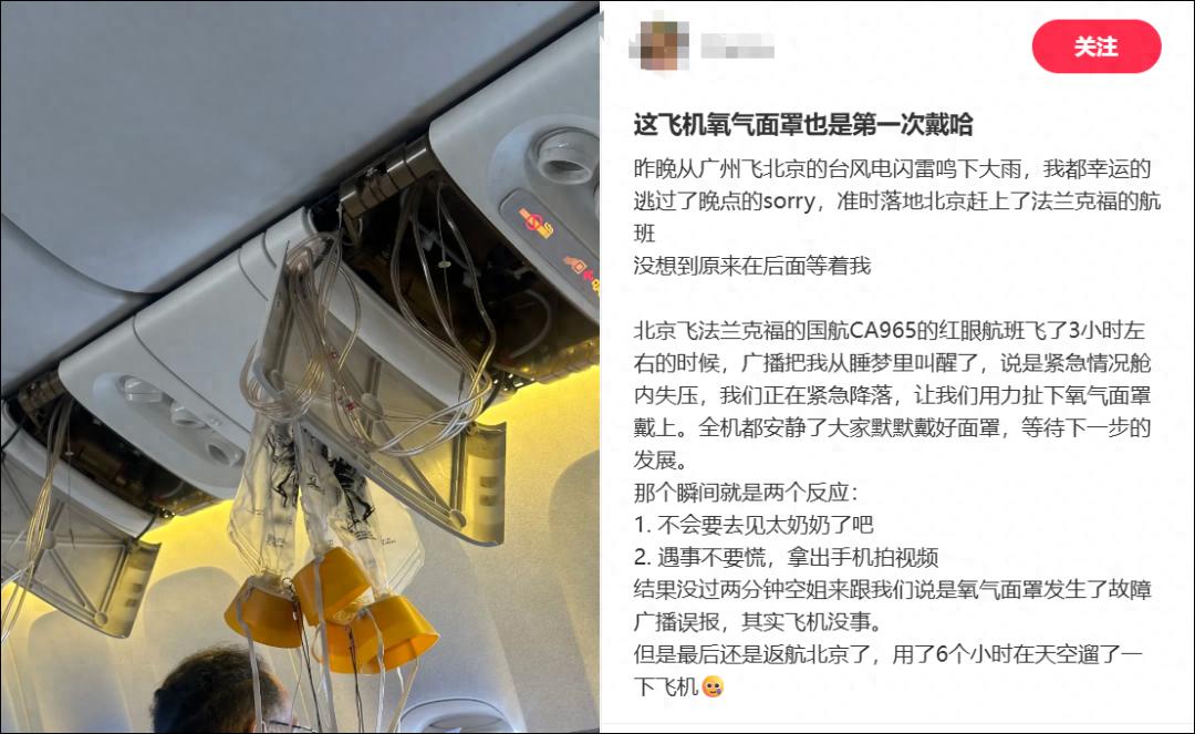 网友称,北京飞法兰克福的国航CA965的航班飞了3小时左右的时候,广播表示紧急情况舱内失压,正在紧急降落,让乘客用力扯下氧气面罩戴上。全机都安静了,大家默默戴好面罩,等待下一步的发展。