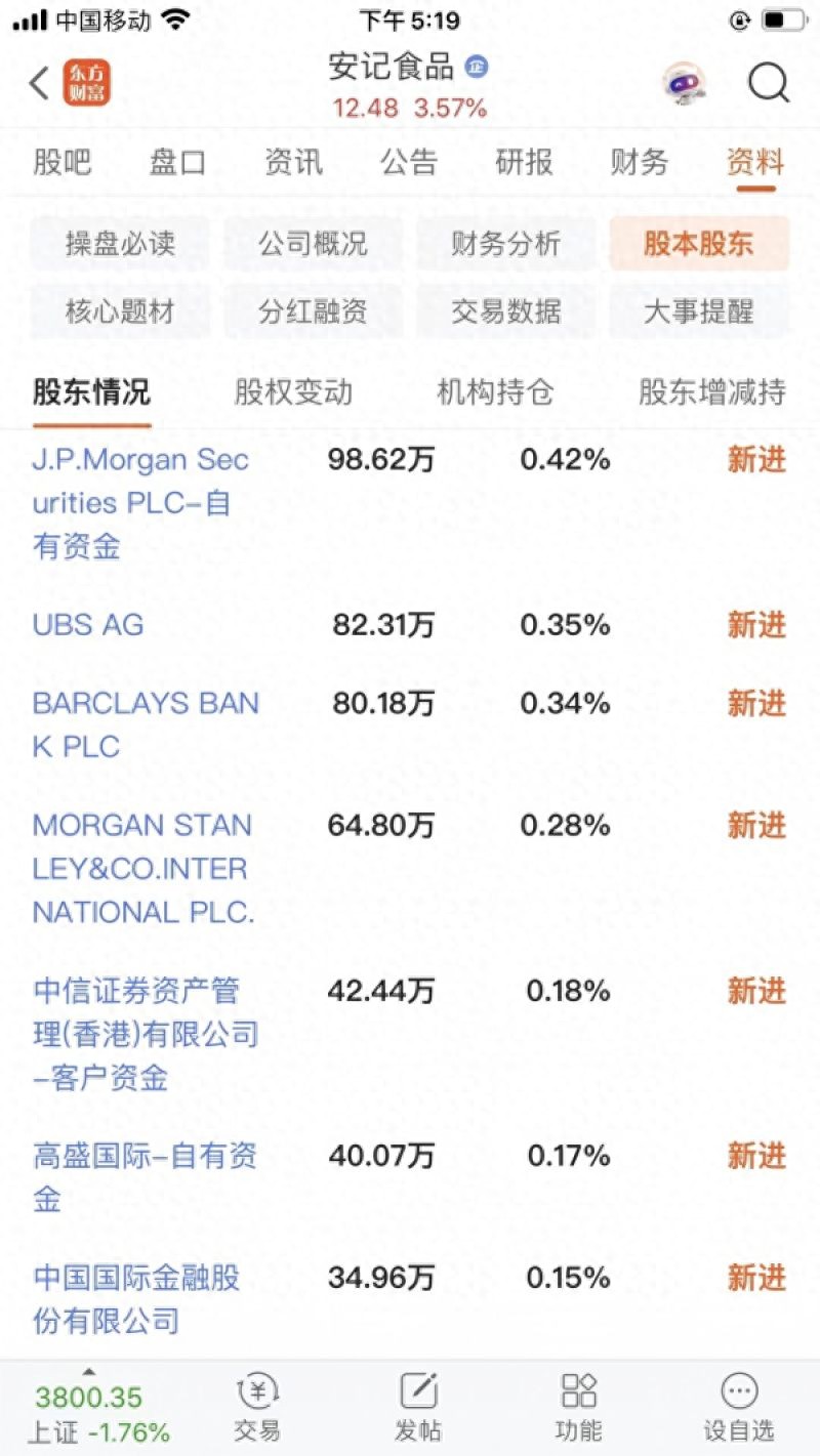“不仅是安记食品,在今年4月份一波食品饮料暴涨的过程中,板块涨幅龙头国芳集团一季报中就有摩根士丹利和瑞银的身影,分别是第九和第十大股东;红宝丽截至二季度末前十大股东也有瑞银、巴克莱银行、摩根大通、摩根士丹利、高盛五家外资机构。”上海一家二级市场私募操盘手王铮受访时透露。