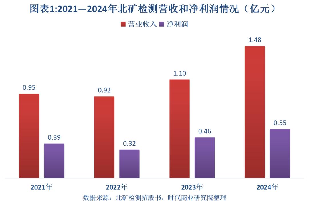 招股书显示,2021—2024年,北矿检测的营收分别为0.95亿元、0.92亿元、1.10亿元、1.48亿元,净利润分别为0.39亿元、0.32亿元、0.46亿元、0.55亿元。由此测算,2021—2024年,北矿检测的营收、净利润年复合增长率分别为16.09%、12.63%。