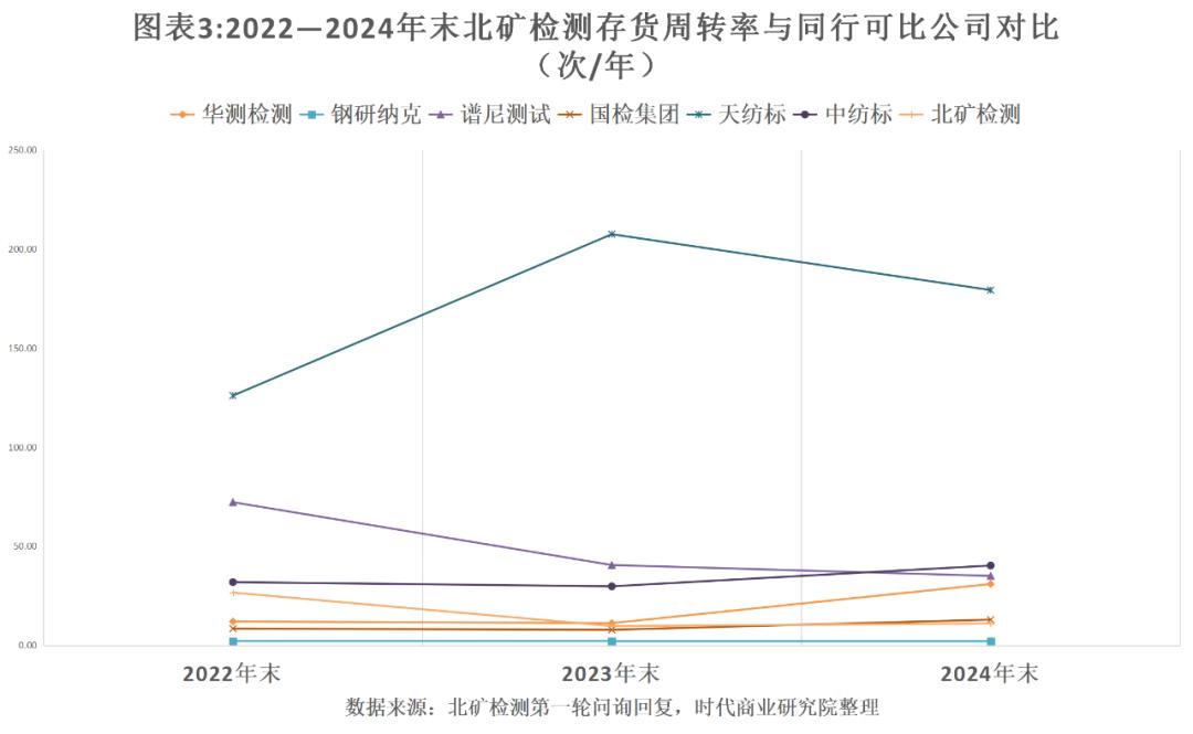 第一轮问询回复显示,报告期各期末,北矿检测的存货周转率分别为26.57次/年、9.69次/年、11.00次/年,而同行可比公司的存货周转率均值分别为42.06次/年、49.76次/年、50.03次/年,远高于北矿检测。从单个企业来看,除了钢研纳克(300797.SZ)、国检集团(603060.SH),其他4家同行可比公司的存货周转率均远高于北矿检测。