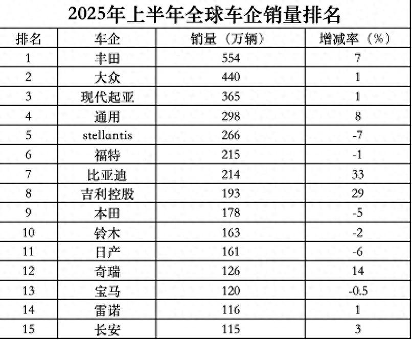 第二名和第三名的位置也没有发生变化,分别是大众和现代起亚。大众紧随丰田之后,上半年销量为440万辆,同比微增1%。其中在中国市场,大众汽车集团2025年上半年共交付131万辆新车,同比小幅下降2.3%。现代起亚上半年销量也同比增长1%至365万辆。