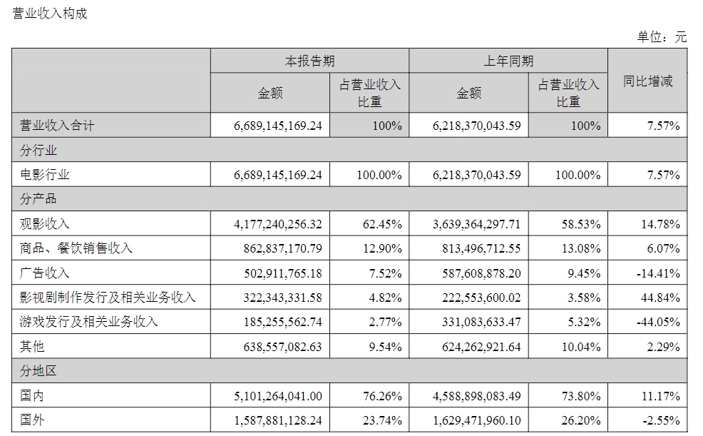 分产品看,2025年上半年,万达电影观影收入为41.77亿元,同比增长14.78%,站营业收入比重为62.45%;商品、餐饮销售收入为8.63亿元,同比增长6.07%,占比12.90%;广告收入5.03亿元,同比减少14.41%,占比7.52%;影视剧制作与发行及相关业务收入为3.22亿元,同比增加44.84%,占比4.82%;游戏发行及相关业务收入为1.85亿元,同比减少44.05%,占比2.77%;其他收入6.39亿元,同比增加2.29%,占比9.54%。