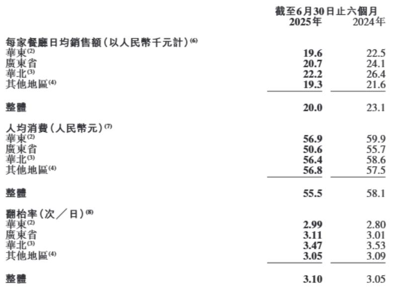 具体指标来看,今年上半年,绿茶集团每家餐厅日均销售额去年同期的2.31万元降至2万元;人均消费较去年同期的58.1元下滑至55.5元;仅有翻台率出现上升,由去年同期的3.05次/日升至3.10次/日。