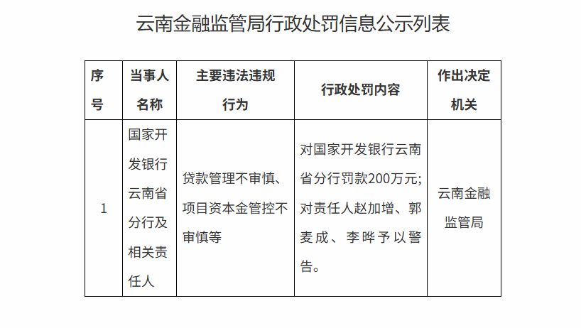 近日,国家金融监督管理总局信息显示,国家开发银行云南省分行及相关责任人因贷款管理不审慎、项目资本金管控不审慎等,被云南金融监管局罚款200万元;对责任人赵某、郭某、李某以警告。