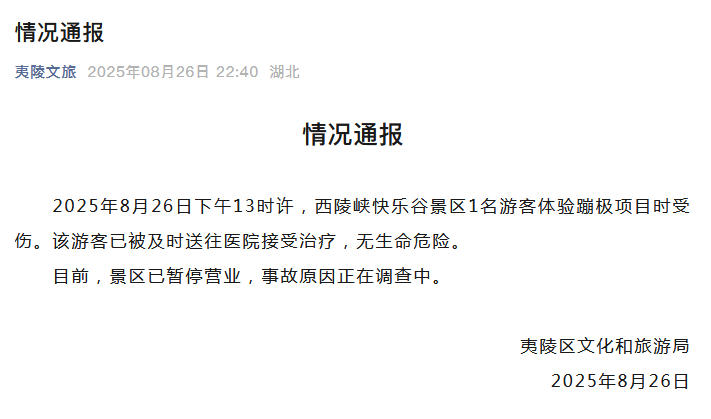 据“夷陵文旅”微信公众号消息,夷陵区文化和旅游局26日发布情况通报称,2025年8月26日下午13时许,西陵峡快乐谷景区1名游客体验蹦极项目时受伤。该游客已被及时送往医院接受治疗,无生命危险。
