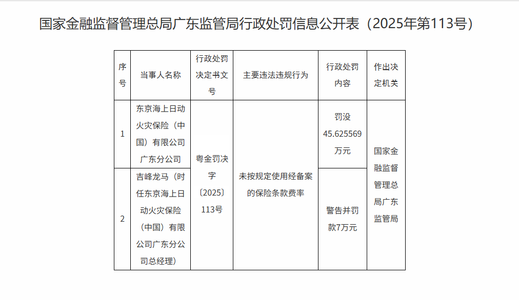近日,国家金融监督管理总局披露处罚信息显示,东京海上日动火灾保险(中国)有限公司广东分公司和吉峰龙马(时任东京海上日动火灾保险(中国)有限公司广东分公司总经理)因未按规定使用经备案的保险条款费率,被国家金融监督管理总局广东监管局分别罚款45.6万元、7万元。