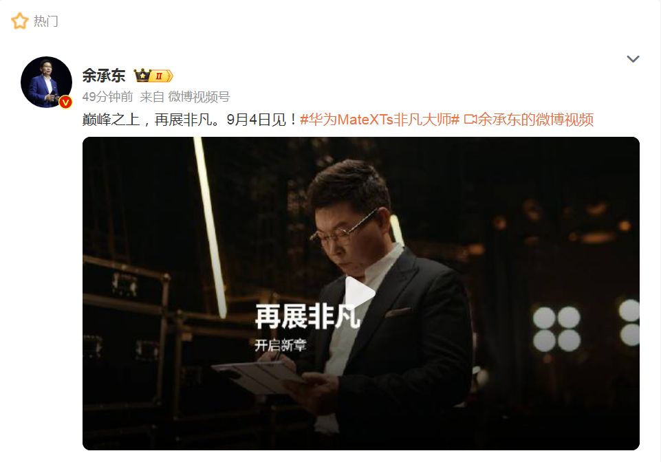 同时,华为常务董事、终端BG董事长余承东微博发文称,巅峰之上,再展非凡。9月4日见。