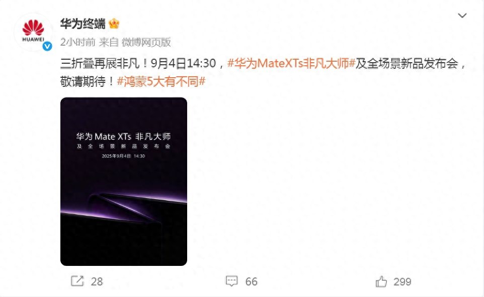 8月27日,华为官宣将于9月4日举办华为Mate XTs非凡大师及全场景新品发布会,将发布新款华为三折叠屏手机。