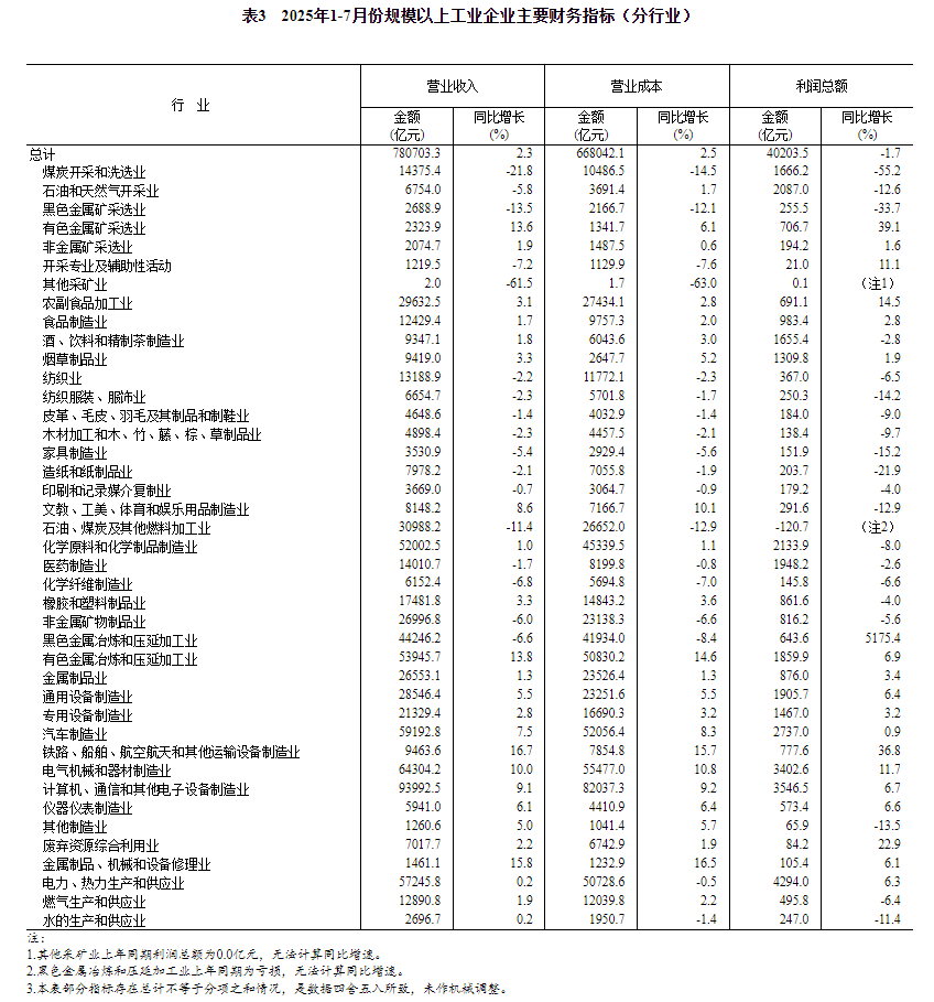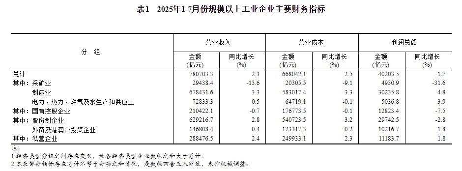 国家统计局消息,1—7月份,全国规模以上工业企业实现利润总额40203.5亿元,同比下降1.7%(按可比口径计算,详见附注二)。
