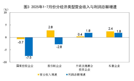 1—7月份,规模以上工业企业中,国有控股企业实现利润总额12823.4亿元,同比下降7.5%;股份制企业实现利润总额29742.5亿元,下降2.8%;外商及港澳台投资企业实现利润总额10216.7亿元,增长1.8%;私营企业实现利润总额11183.7亿元,增长1.8%。