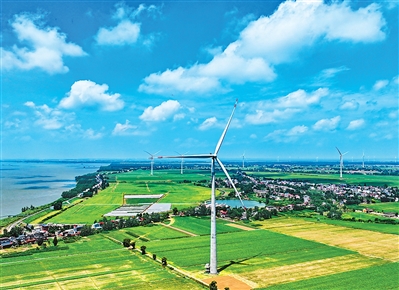 江西省九江市彭泽县棉船镇,十余台风力发电机迎风旋转,与村庄、农田相映成趣,构成一幅风光旖旎、绿意盎然的江景画卷。