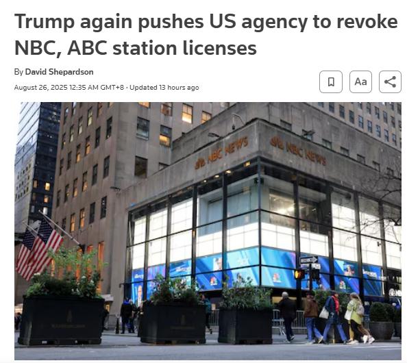 据路透社报道,美国总统特朗普日前再次敦促美国联邦通信委员会(FCC)吊销迪士尼旗下ABC和康卡斯特旗下NBC新闻两家美国广播电视公司牌照。