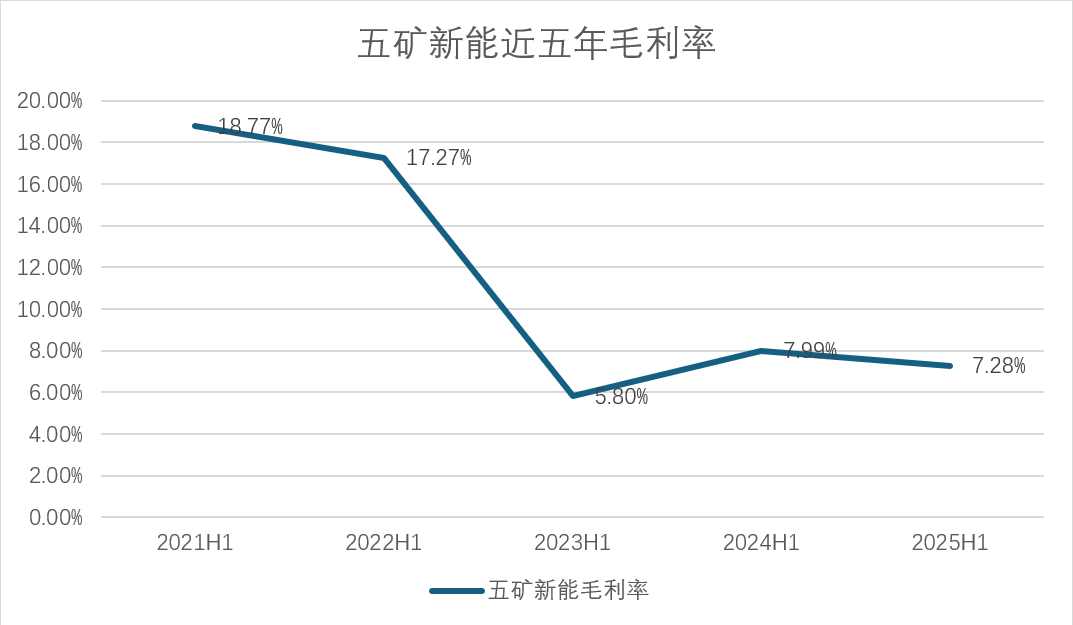 五矿新能毛利率 “跳水式”下滑显示的更为直接,从2021年上半年的18.77%下降至2025年上半年的7.28%。2024年,公司综合毛利率更是只有2.95%,同比减少1.75个百分点。