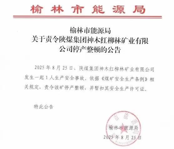 记者了解到,榆林市能源局已出具停产整顿公告。公告提到,8月25日,红柳林煤矿发生一起1人生产安全事故。依据《煤矿安全生产条例》相关规定,责令该矿停产整顿,并暂扣其安全生产许可证。