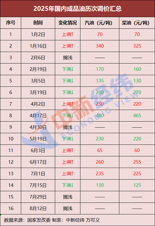 中新经纬注意到,今年以来,国内油价已经历十六轮调价窗口,分别为“六涨六跌四搁浅”。涨跌互抵后,国内汽、柴油价格每吨较去年底分别下调225元、215元。若本轮调价落地,2025年的调价格局将变为“六涨七跌四搁浅”。