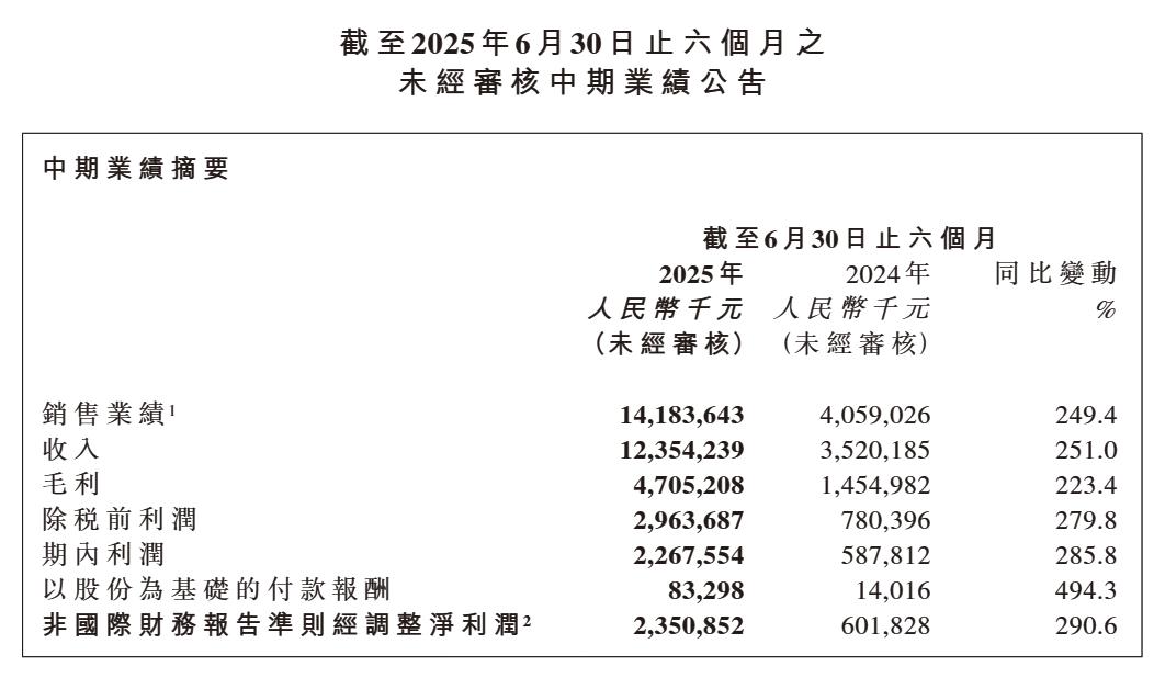 据老铺黄金2025年中期财报,今年上半年,老铺黄金实现营收123.54亿人民币,较同期增长251.0%;净利润22.67亿元,同比增长285.8%;经调整后的净利润达23.51亿元,同比增长290.6%。公司经调整净利率上涨近2个百分点,增至19%。