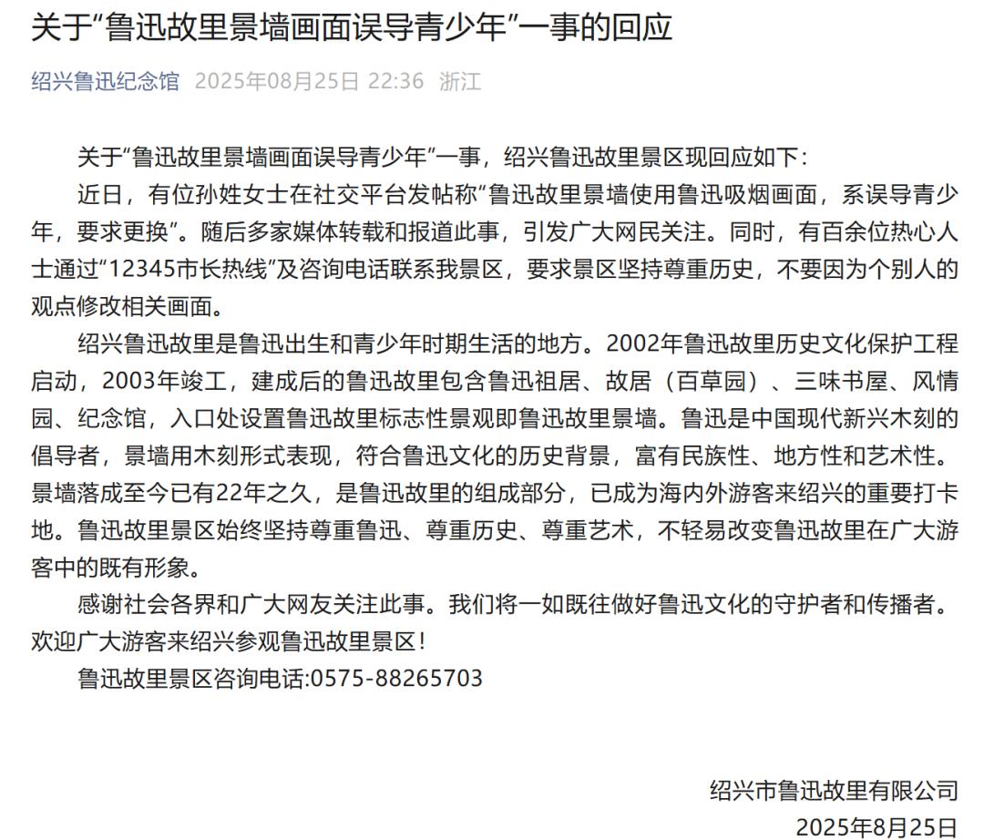 8月25日晚,绍兴鲁迅纪念馆官方发文回应关于“鲁迅故里景墙画面误导青少年”一事: